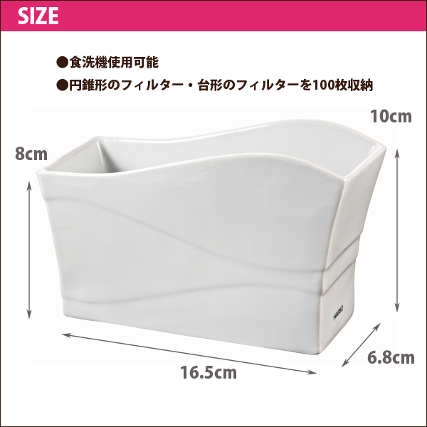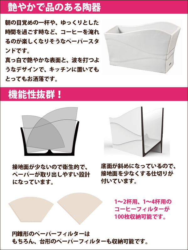 商品情報 円錐形や台形のフィルターを100枚収納できるペーパースタンド。